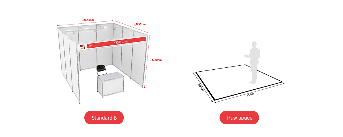 Standard B 3m X 3m X 2.5m Sign board, Lighting, 1 Electrical outlet (1kw; 220V), 1 Information desk, 1 Chair $ 2,000